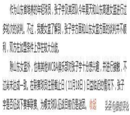 根据媒体人“我爱女篮”的爆料,张子宇新赛季能否顺利登陆WCBA目前仍有诸多不确定性。
