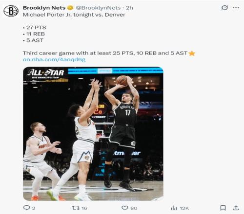 小迈克尔-波特是今夏掘金用1首轮送到篮网换走的卡约,此役小波特也算是手刃旧主了,他带领孱弱的篮网击败了掘金,小波特来到篮网后终于开始打出全明星的水准,半场16分,全场比赛32分钟,17中8,三分6中2,罚球9中9,拿到27分11篮板5助攻1盖帽,命中率47.1%。