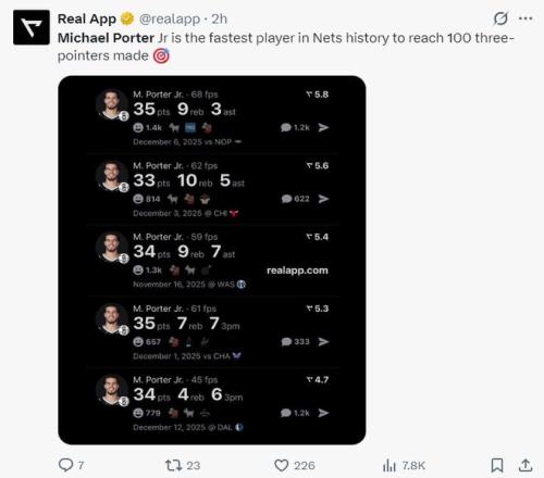 小波特也成为篮网队史最快命中100+三分的球员,目前联盟前四三分命中数+三分命中率40%以上的只有四人:小波特、克努佩尔、穆雷、吉莱斯皮。