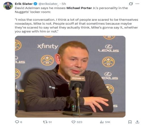 阿德尔曼也谈到小波特之前在掘金更衣室的一些事件,他表示自己还很怀念,不过休赛期那笔交易其实对篮网、掘金都有好处。