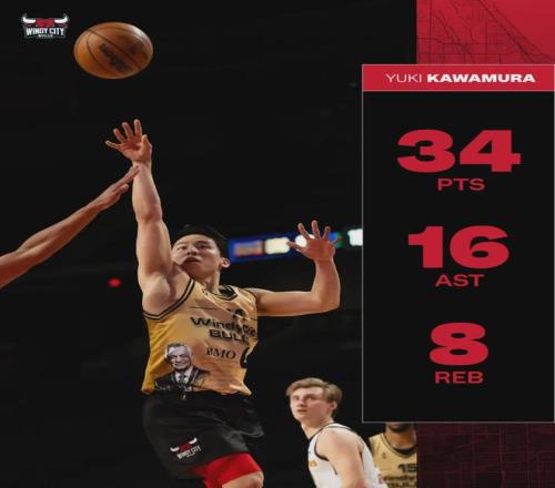 近日河村勇辉出战G联赛,首发登场40分钟里投篮24中12,其中三分球6中3,罚球4中4爆砍生涯新高的34分16助外加8板(赛季新高),可惜所在的风城公牛131-135惜败大急流城黄金。